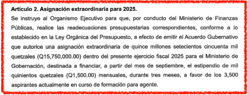 Para este año, en caso de que se aprobara la norma, se instruye emitir un acuerdo gubernativo que autorice una asignación extraordinaria de Q15.75 millones para cubrir el aporte durante tres meses para los 3,500 estudiantes que están en formación.