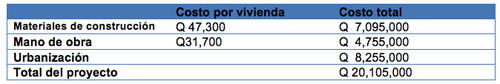 Los materiales de construcción para cada una de las casas tendrán un precio de 47 mil 300 quetzales y la mano de obra, por cada vivienda, será de 31 mil 700 quetzales. El costo total del proyecto, incluyendo la urbanización de drenajes, servicio de agua potable, luz eléctrica y pavimentación de calles será de 20 millones 105 mil quetzales.