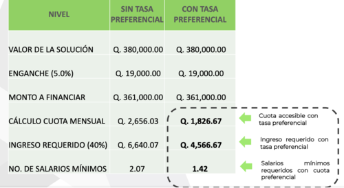 Así mismo, el tipo de vivienda también tendrá un límite, pues la tasa preferencial se otorgará a viviendas cuyo precio estén hasta un máximo de Q500 mil.
