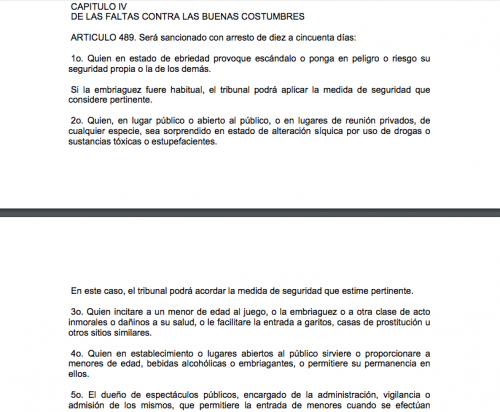 Según el Código Penal, en su artículo 489, se establecen sanciones de entre 10 y 50 días de prisión a "quien en estado de ebriedad provoque escándalo o ponga en peligro su seguridad propia". Además, se habla de penas para quien altere el orden público en lugares abiertos o reuniones privadas.