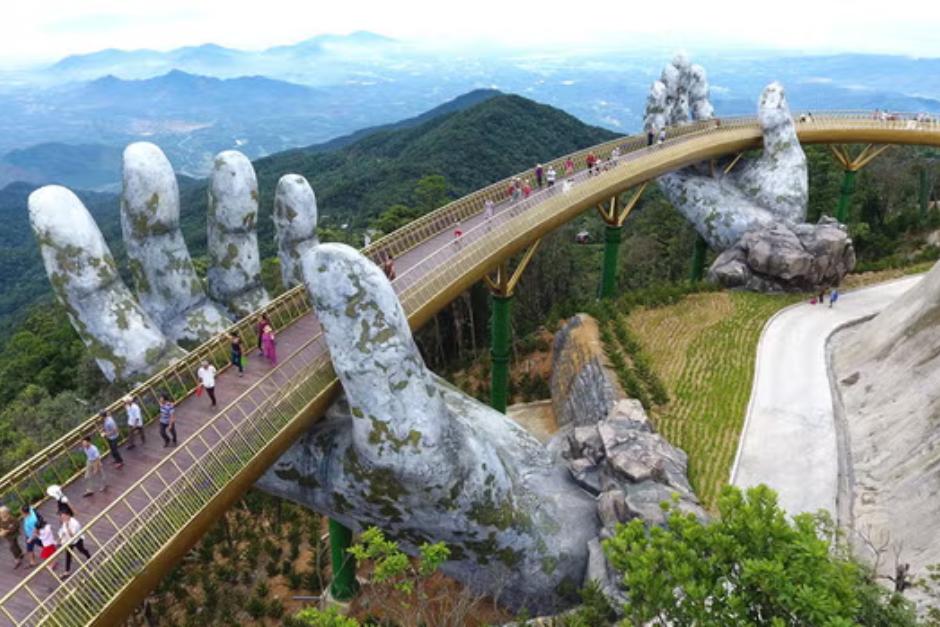 Vietnam ha captado la atención del turismo mundial con una de sus estructuras más icónicas: el puente "Cau Vang" o "Puente Dorado", que parece flotar gracias a dos gigantescas manos de piedra que lo sostienen en la cima de una colina en Da Nang.