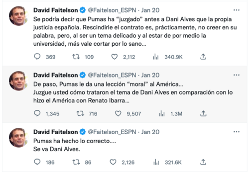 "De paso, Pumas le da una lección "moral" al América...Juzgue usted cómo trataron el tema de Dani Alves en comparación con lo hizo el América con Renato Ibarra...Pumas ha hecho lo correcto.... Se va Dani Alves", agregó Faitelson recordando el incidente de Ibarra, el futbolista ecuatoriano acusado de violencia familiar en marzo de 2021. El América no dio una postura al respecto e incluso el ecuatoriano fue incorporado al torneo al Atlas.