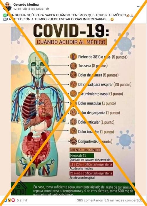 Una infografía que asigna puntos a una lista de síntomas de Covid-19 y recomienda ir o no al médico según el puntaje obtenido ha sido compartida más de 11,000 veces en redes sociales desde el pasado 17 de junio. Sin embargo, la escala carece de validez científica, de acuerdo a los especialistas consultados.