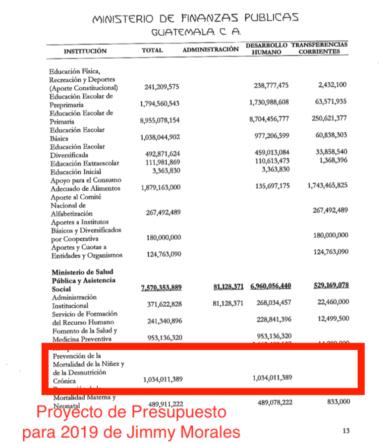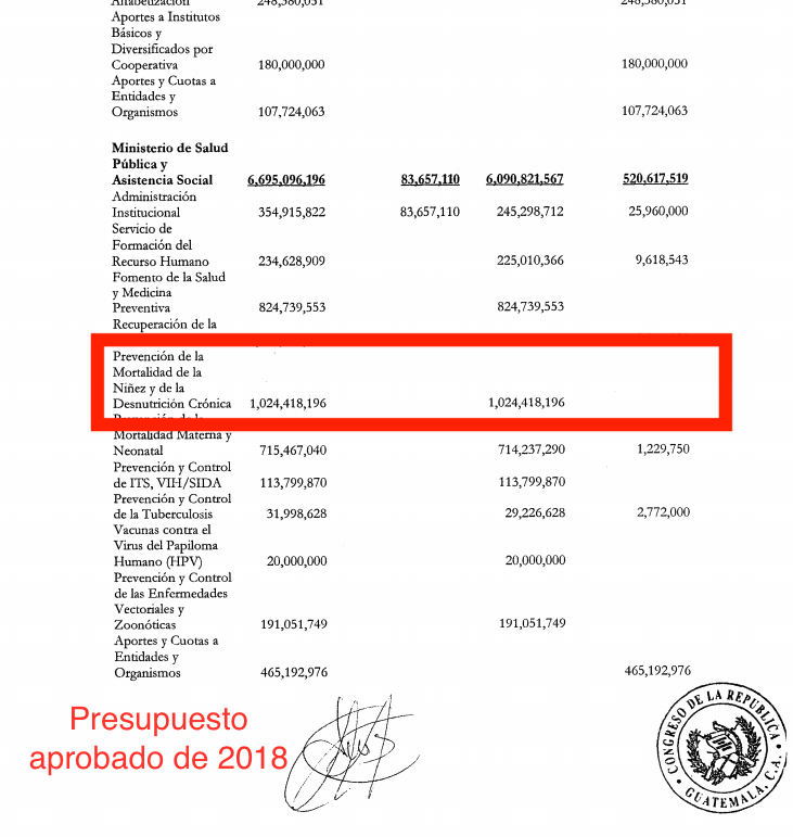 Haciendo una comparación entre el Presupuesto que rigió durante el año pasado y el proyecto de presupuesto que presentó el Gobierno de Morales al Congreso, se puede observar que para el Prevención de la Mortalidad de la Niñez y de la Desnutrición Crónica, sólo hubo un incremento de 10 millones de quetzales aproximadamente.