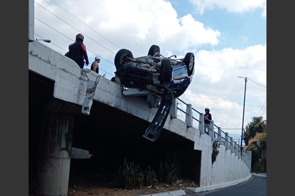 Un vehículo se accidentó al final de un paso a desnivel en San Cristóbal y terminó volcado, a punto de caer, según informó Mynor Espinoza, vocero de la Municipalidad de Mixco.