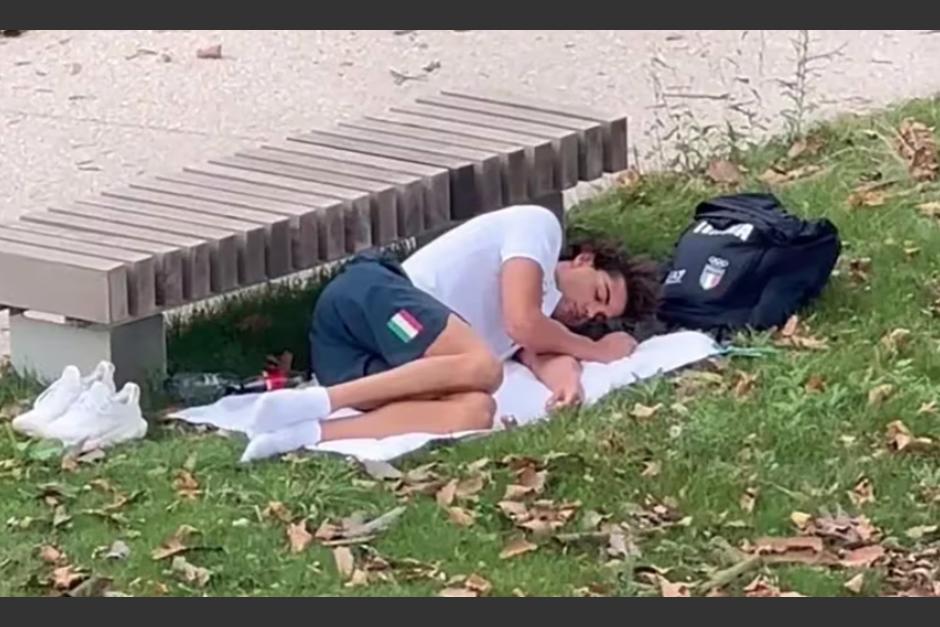Thomas Ceccon, campeón olímpico en París 2024, fue fotografiado durmiendo al aire libre en un parque.