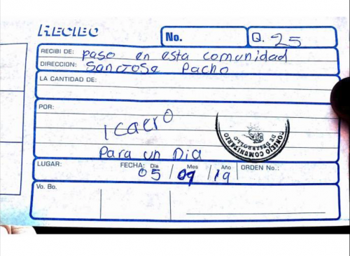Los pobladores cobran 25 quetzales a cada vehículo de cuatro ruedas y 10 quetzales a las motocicletas por "derecho de paso" por la comunidad y extienden recibos a quienes lo requieran.