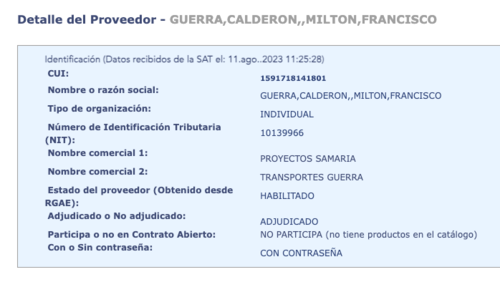 Las últimas dos adjudicaciones se registran del 24 de agosto para la Municipalidad de Mojas en el departamento de Jalapa, que en conjunto suman Q 999.2 mil. Sin embargo, fue contratado para el mejoramiento de una calle en la aldea el Salamo Monjas, Jalapa.