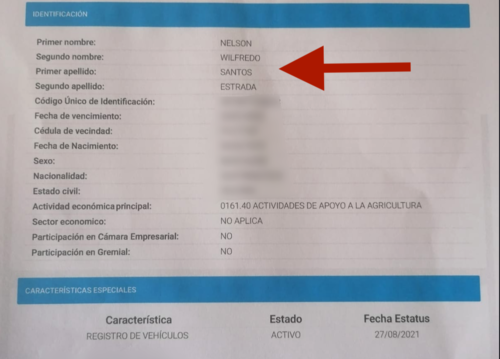 Diez días después, el 27 de agosto de 2021, Santos registró un vehículo a su nombre el que se encuentra activo.
