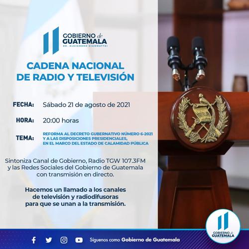 La tarde del 21 de agosto se dio a conocer que habría cadena nacional en horas de la noche, para dar un mensaje el presidente de la República, Alejandro Giammattei.