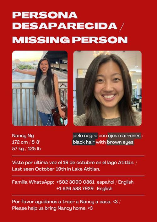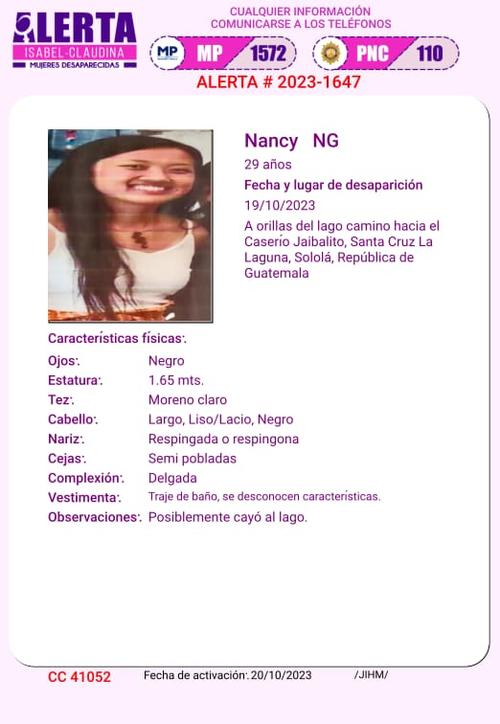 Se trata de la estadounidense Nancy NG, de 29 años, quien fue vista por última vez el pasado jueves 19 de octubre, a orillas del lago, camino al caserío Jaibalito. Los familiares de la turista también han publicado mensajes en las redes sociales, en los cuales piden ayudar para "traer a Nancy a casa".