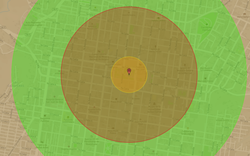En este espacio los edificios de concreto pueden sufrir daños en la estructura, prácticamente demoliéndose con la explosión. Todos quienes estén dentro de este radio no sobrevivirían.