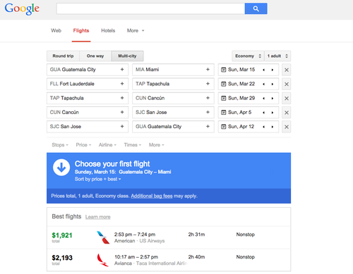 La aplicación permite organizar un viaje con hasta cinco vuelos. Además puedes encontrar vuelos genéricos como "vuelos a Europa" o "vuelos a Guatemala".