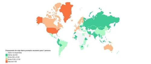 En el siguiente mapa señala el presupuesto de viaje diario promedio necesario para 1 persona, incluso el costo más bajo es de Q382,23 ($50).
