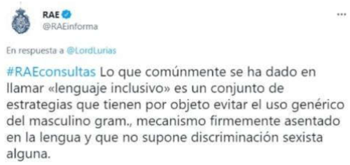 A través de la cuenta de Twitter de la RAE, calificó como "artificiales" los pronombres inclusivos, en especial los que terminan con la letra e, como son: elle, o todes.