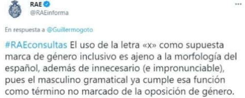 La RAE expresa que el uso de la letra "X" en el lenguaje inclusivo "es ajeno a la morfología del español, además de innecesario (e impronunciable), pues el masculino gramatical ya cumple esa función como término no marcado de la oposición de género".