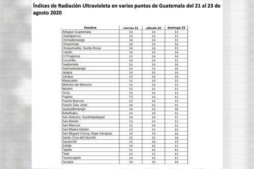 El Ministerio de Salud Pública y Asistencia Social (MSPAS) alertó sobre un incremento significativo de los rayos ultravioleta del Sol, por lo que recomienda evitar las exposiciones prolongadas en este fin de semana.