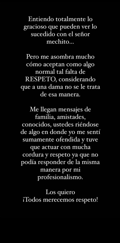 Posteriormente, la locutora compartió una story en Instagram en el que manifestó su rechazo por el trato recibido y resaltó que todas las personas merecen respeto.