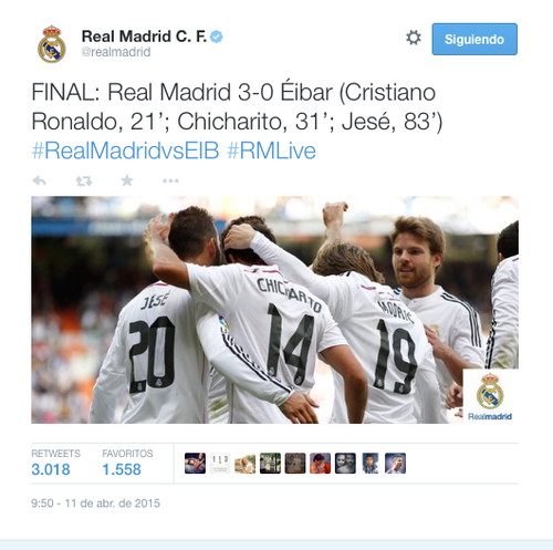 Real Madrid hizo lo suyo en la jornada 31 de la Liga española y derrotó 3-0 al Éibar con dos goles en el primer tiempo, obra de Cristiano Ronaldo y Javier Hernández. El tercer llegó en el complemento vía Jesé.