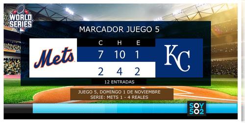 El bateador emergente Christian Colón pegó sencillo impulsador en la parte alta de la duodécima entrada y el corredor Jarrod Dyson anotó la carrera de la ventaja de los Reales de Kansas City que se impusieron por 7-2 a los Mets de Nueva York en el quinto partido de la Serie Mundial y se proclamaron nuevos campeones del "Clásico de Otoño".