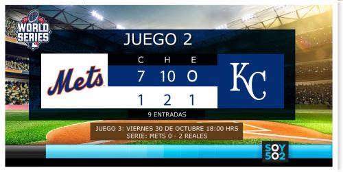 Con soberbio pitcheo de ruta completa del dominicano Johnny Cueto, los Reales de Kansas City vencieron este miércoles 7-1 a los Mets de Nueva York y se fueron 2-0 al frente en la Serie Mundial de béisbol.