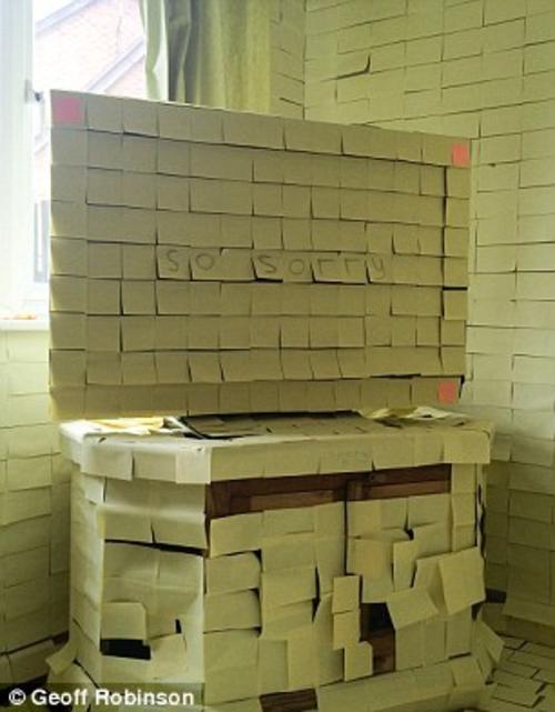 Una pareja de recién casados se llevó tremenda sorpresa al regresar de su Luna de Miel y encontrar la casa "tapizada" de Post-It. Los amigos que eran los encargos de darle de comer a sus mascotas les jugaron la broma.