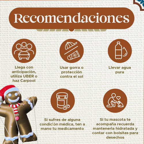 - Si asistes con tu mascota, mantenla hidratada y lleva bolsitas para desechos