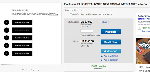 Creada el año pasado como una red social "privada", Ello (www.ello.co) recientemente abrió sus puertas, aunque únicamente en base a invitación. Debido a la oferta limitada y la gran demanda, las invitaciones se han estado vendiendo en eBay a precios de hasta 500 dólares. Algunos informes sostienen que Ello está recibiendo hasta 35.000 pedidos por hora como resultado de una viralización la última semana.