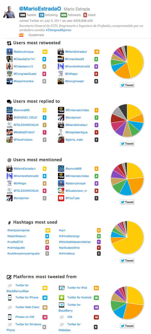De momento los tres candidatos con mayor intención de voto, según estadísticas publicadas en distintos medios, se mantienen muy activos en Twitter, pero muy a su estilo. El primero, Baldizón, apoyando el futuro futbolístico de su hijo; el segundo, Sinibaldi, echando mano de los profundos pensamientos del "Poeta del Cielo"; y la tercera, Sandra Torres, dando consejos de tipo "Tía Consuelo" a diestra y siniestra.