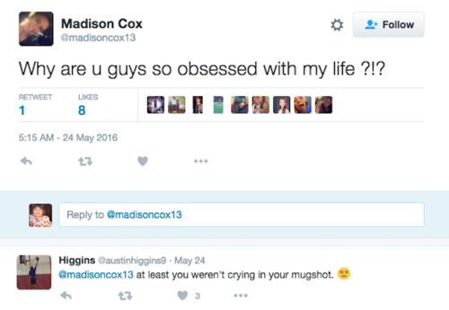 Aunque medios estadounidenses intentaron contactar con ella, se negó a dar entrevistas. En cambio, publicó en su cuenta de Twitter un mensaje: "¿En verdad me pusieron en las noticias porque fui a prisión por una receta médica?", aunque después lo eliminó y publicó otro: "Debo dejar de ser menos infantil y mantener mi boca cerrada".