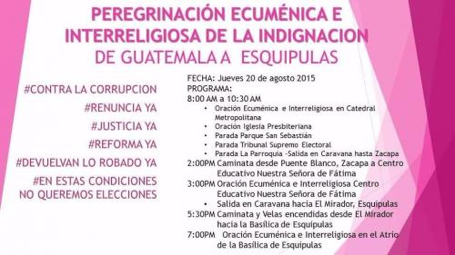 Las actividades iniciaron a las 8 de la mañana frente a Catedral Metropolitana, posteriormente hubo una Oración en la Iglesia Presbiteriana, una parada en el Parque San Sebastián, otra en el Tribunal Supremo Electoral y una más en la iglesia La Parroquía, de donde salió una caravana hacia Zacapa, luego sale hacia El Mirador de Esquipulas, desde donde se tiene prevista la “Caminata de las velas encendidas” que finalizará en el atrio de la Basílica de Esquipulas.