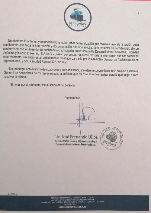 También el congresista Luis Fernando Pineda, mostró su molestia por que el contrato no sea revelado: “El Ministro de Mineco, el PGN y el administrador de Ferrovías insisten en que el negocio del ferrocarril con la empresa mexicana Remed es un asunto privado, pero es falso, el Estado posee 80% de las acciones de Ferrovías. Están haciendo piñata los bienes de toda la población”, comentó.