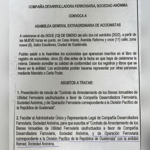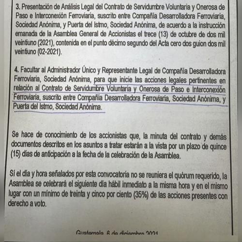 Se sabe que se trata de un contrato de servidumbre voluntaria y onerosa de paso de interconexión ferroviaria suscrito entre Ferrovías y Puerta del Istmo, S.A. surgida de la anterior asamblea general de accionistas, celebrada en diciembre de 2021, según detalla una convocatoria den Diario de Centro América.