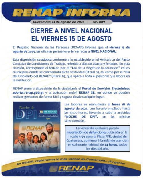 El Registro Nacional de las Personas (Renap) informó este miércoles que el próximo viernes 15 de agosto de 2025, las oficinas de todo el país permanecerán cerradas.