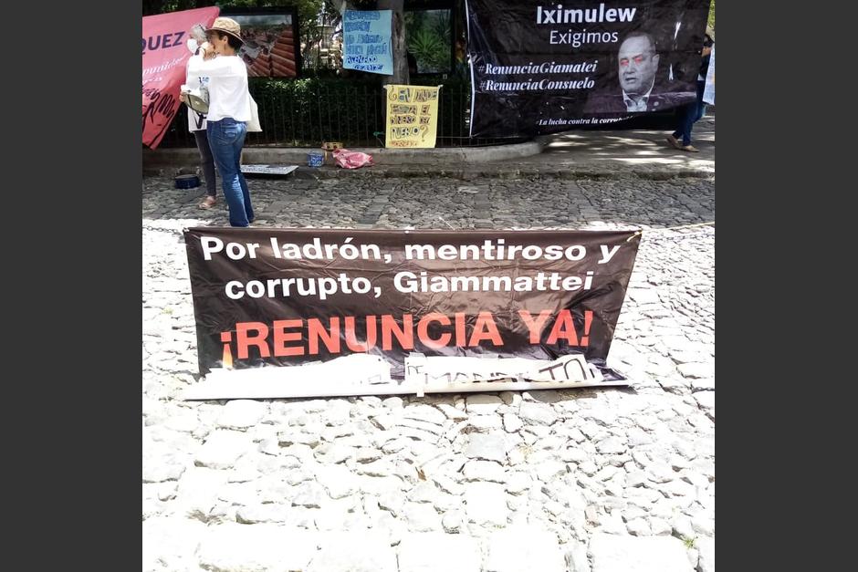 "Renuncia Giammattei", "Giammattei non grato", "Fuera Giammattei", son algunos de los mensajes que se lee en pancartas de manifestantes en la Antigua Guatemala.