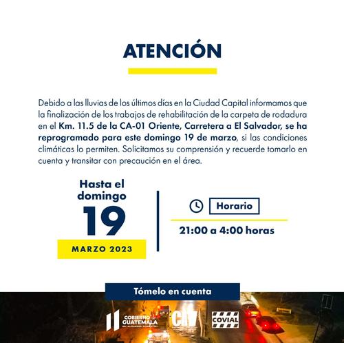 La Unidad Ejecutora de Conservación Vial (Covial) informó que debido a las lluvias de los últimos días la finalización de los trabajos en el kilómetro 11.5 de la ruta a El Salvador, se reprogramaron para el domingo 19 de marzo.