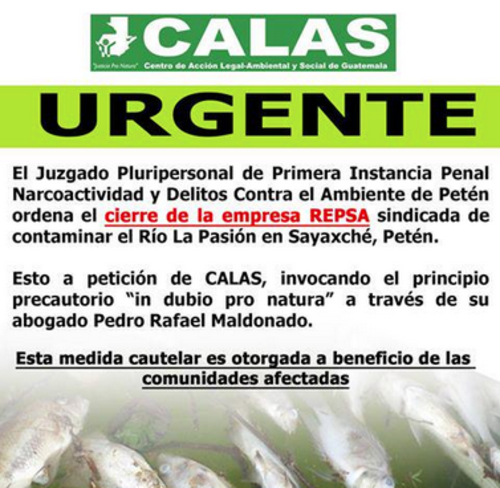 La audiencia unilateral que se llevó a cabo en el juzgado de Primera Instancia de Narcoactividad y Delitos Contra el Ambiente, con el Centro de Acción Legal Ambiental y Social de Guatemala (CALAS) como querellante adhesivo, concluyó con la resolución de que la empresa deberá cesar comercialmente durante seis meses.