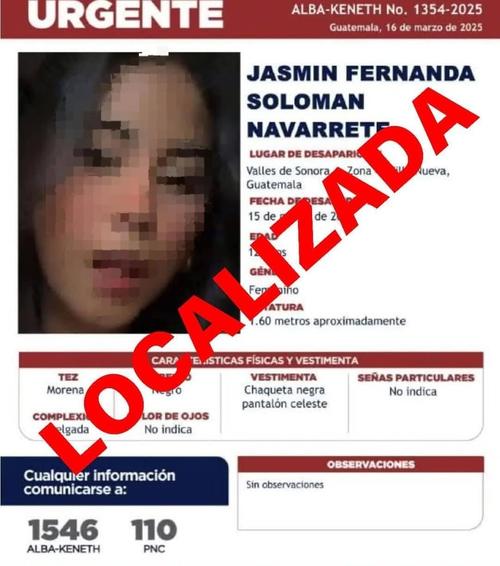 Según detallaron, la menor de 15 años que desapareció en zona 4 de Villa Nueva fue hallada durante la jornada del domingo 16 de marzo, horas después del reporte de desaparición que hizo García en redes.