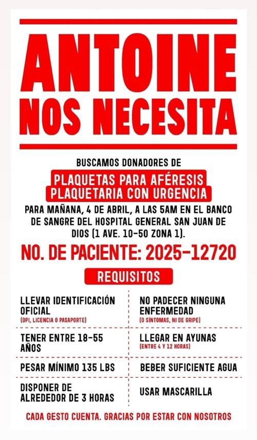 Quienes deseen y puedan hacerlo, deben presentarse mañana 4 de abril a las 5:00 horas en el Hospital General San Juan de Dios, 1.ª avenida 10-50 zona 1 capitalina.