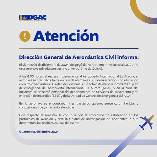 La DGAC indicó que tres personas que viajaban en la avioneta presentaron heridas y contusiones, las cuales ya fueron atendidas.