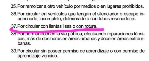 Tal es el caso del estado de las llantas. El artículo 181 en su numeral 37 indica que por "circular con llantas lisas o con rotura", el conductor recibirá una multa de Q200.