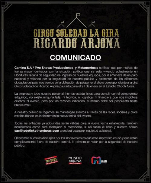 El concierto que el cantautor guatemalteco Ricardo Arjona tenía previsto para el próximo 21 de enero en el estadio Chochi Sosa en Honduras, fue cancelado.