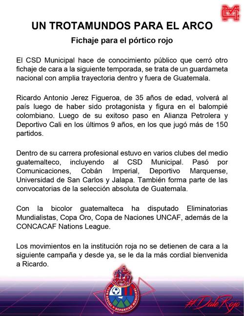 "Ricardo Jerez, de 35 años, volverá al país luego de haber sido protagonista y figura en el balompié colombiano. Luego de su exitoso paso en Alianza Petrolera y Deportivo Cali en los último nueve años, en los que jugó más de 150 partidos", indica el club en su comunicado.