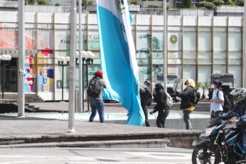Un grupo de personas que se movilizaba a la manifestación en el Parque Central capitalino, bajó el pabellón nacional ubicado al frente del Banco de Guatemala, según se constató en fotografías compartidas en redes sociales.