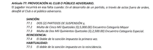 Según el reglamento de la Federación Nacional de Fútbol de Guatemala, en el artículo 77, la provocación al club o público adversario es sancionada.
