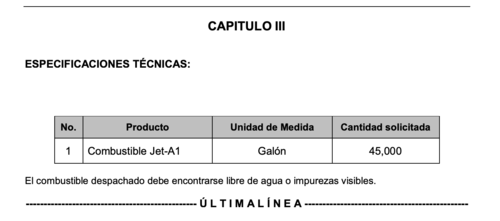 Según la descripción, difundida desde el pasado 15 de marzo, la SAAS busca adquirir combustible clase Jet-A1 para ser utilizado en las diferentes aeronaves asignadas al hangar presidencial.