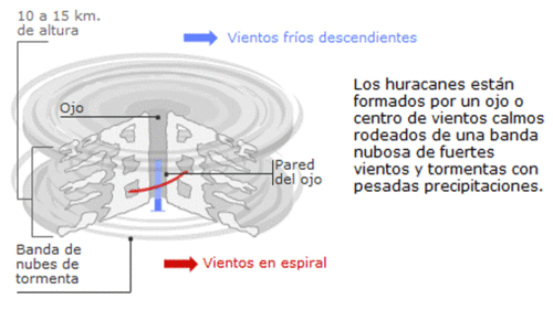 Los huracanes están formados por un ojoo centro de vientos calmos rodeados de una banda nubosa de fuertes vientos y tormentas con pesadas precipitaciones.