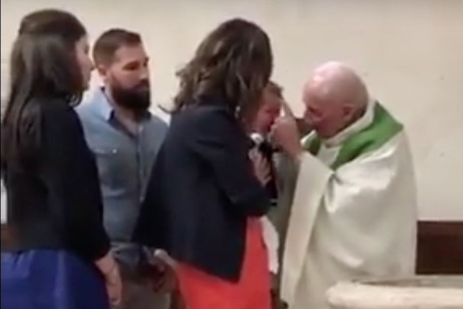 La grabación, que tuvo lugar en una iglesia de Francia, permite ver que el cura tomó el rostro del pequeño, quien lloraba en los brazos de su madre.
