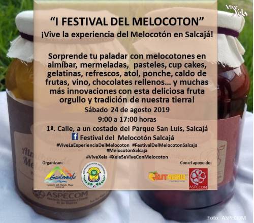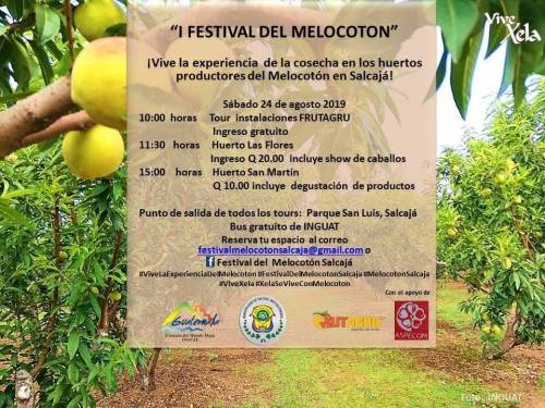 El I Festival de Melocotón Salcajá se celebrará el 24 de agosto en dicho municipio. Si deseas participar en los recorridos, deberás reservar tu espacio al correo festivalmelocotonsalcaja@gmail.com o consultar en la Fanpage Festival del Melocotón Salcajá. Los traslados en bus serán gratuitos, pero en Las Flores deberás pagar Q20 por persona, mientras que en el huerto San Martín la entrada es de Q10.