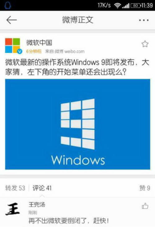 La división de la compañía en China ha publicado por error un mensaje en su cuenta social Weibo, anunciando a los usuarios que “Windows 9 llegará pronto”, y preguntando si les gustaría ver el menú de inicio de vuelta. El mensaje fue borrado minutos después.